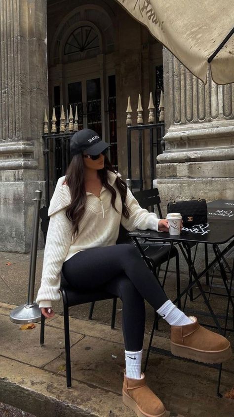 This style mixes soft cream knits with black leggings and platform chestnut Uggs, creating balance between cozy and sharp. It’s flattering for most figures as leggings elongate, though chunky Uggs add playful volume.