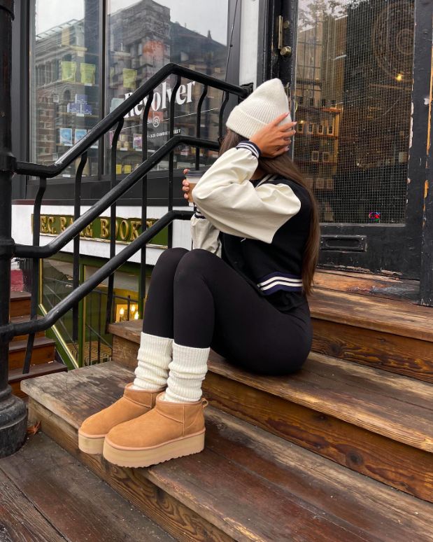 This style leans straight into winter casual comfort — think leggings, a varsity jacket, and short chestnut Uggs with chunky socks. It’s a youthful, playful outfit that flatters most body types since the silhouette is simple and streamlined. Best for off-duty days, brunch with friends, or study sessions, but maybe not polished enough for formal dinners.