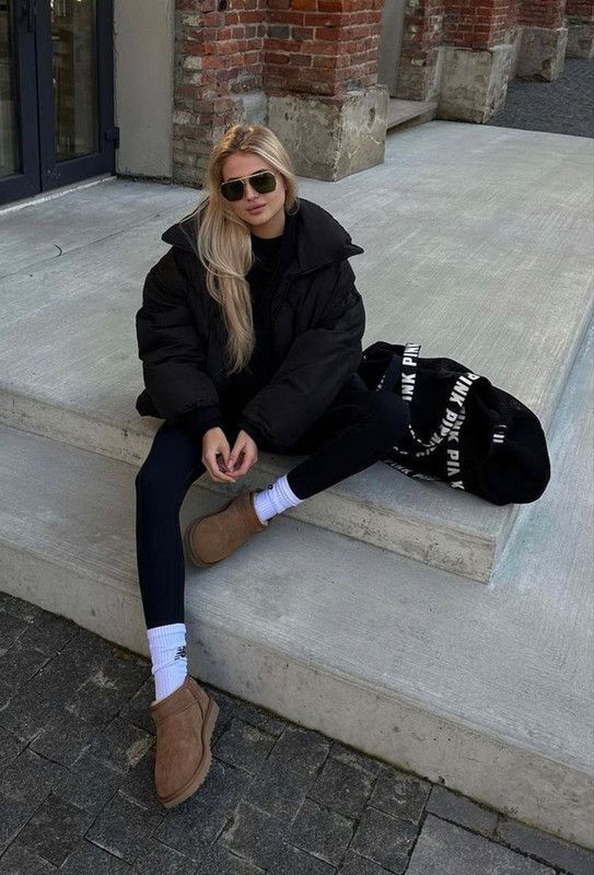 All-black pieces paired with brown Uggs? Timeless. The oversized puffer coat, slim leggings, and short Uggs make this outfit equal parts functional and fashion-forward. It’s especially great for petite women, since the monochrome underlayer keeps proportions lean while the coat adds volume without overwhelming. Perfect for winter walks or casual days in the city, but maybe too relaxed for business settings.