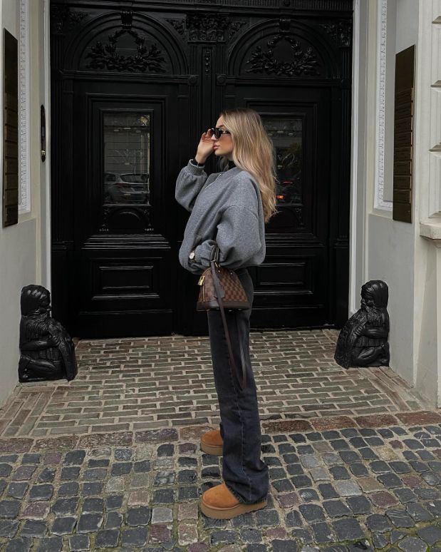 Grey tones paired with platform Uggs in chestnut create an understated yet fashion-forward winter outfit. The cropped sweatshirt tucked into wide jeans makes this ensemble perfect for tall women who want balance between structure and slouch. It’s cozy enough for casual afternoons but stylish enough for gallery hopping or weekend markets.