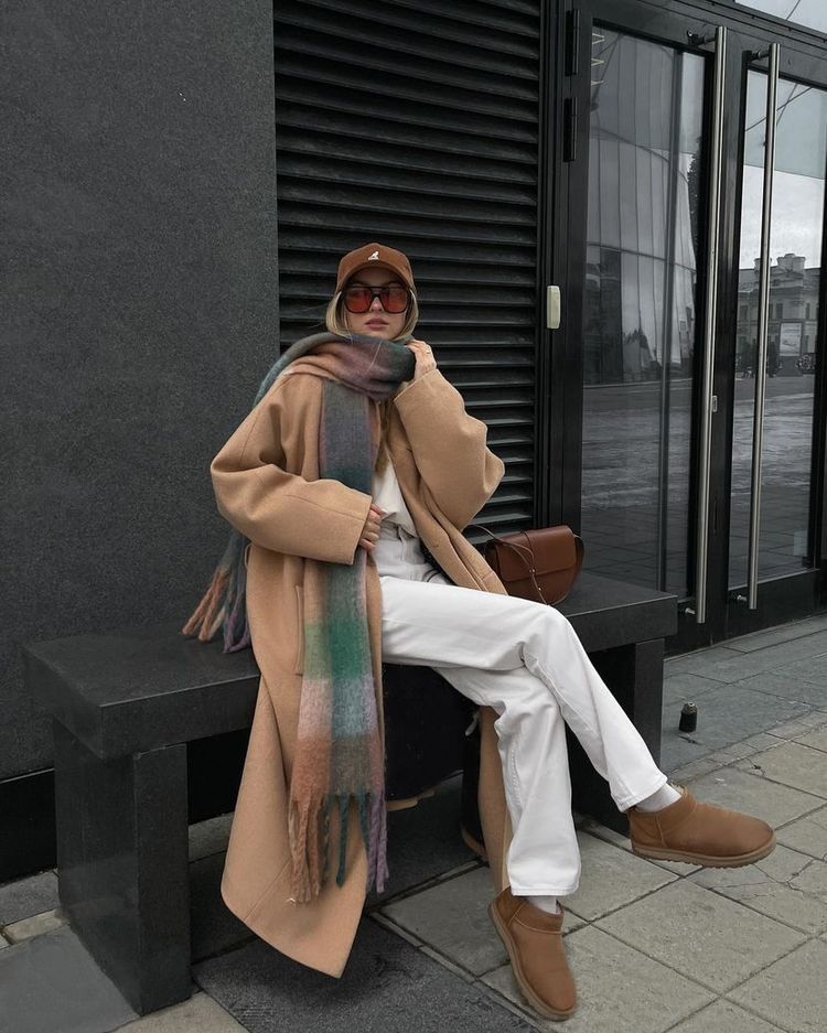 A monochrome base in white layered with a camel coat is classic winter style. Add short chestnut Uggs, and suddenly the look is both cozy and sophisticated. This works beautifully for medium to tall figures, elongating the lines. Great for office commutes or winter brunches, but avoid messy outdoor activities — the white will suffer!
