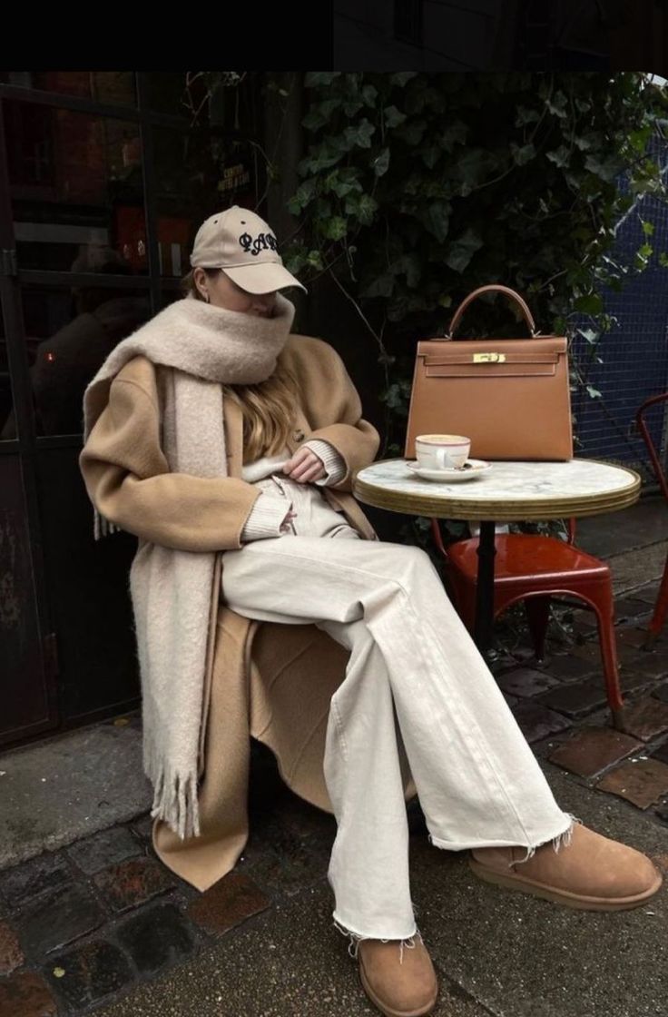This outfit leans more elegant: long camel coat, oversized scarf, cream trousers, and brown Uggs. Perfect for winter café dates or outdoor Christmas markets. Works best for taller women since wide-legged cream jeans need length to drape well.