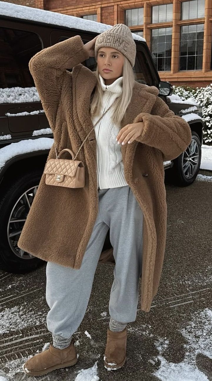 Teddy coats are back for 2025–2026, and when paired with short brown Uggs, they create the ultimate sporty-luxe winter vibe. The jogger silhouette works for most body types, making this the comfiest of all the looks. Ideal for ski towns, Sunday strolls, or casual meetups — though not sharp enough for business events.