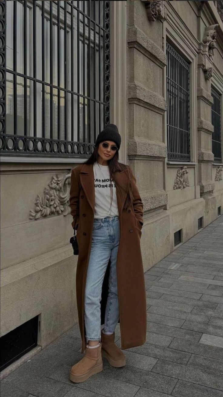 Minimal yet powerful, this outfit revolves around a long brown coat layered over a simple graphic tee and blue winter jeans. The star? The platform chestnut Uggs. They ground the look with casual edge while keeping the vibe city-ready. This look flatters straight and hourglass figures alike as the coat length elongates the silhouette. Perfect for city errands, coffee meetups, or casual Fridays at the office.
