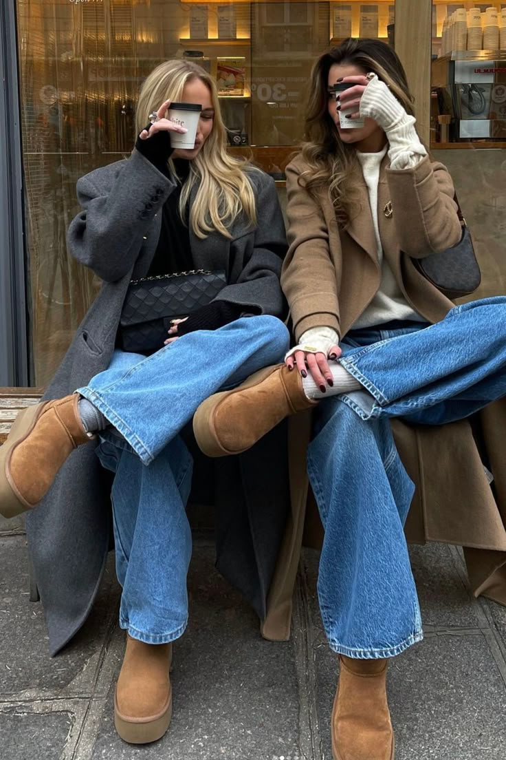 This duo proves that Uggs are even better when styled in pairs. Two friends, both in oversized coats — one in gray, one in camel — with wide-leg blue winter jeans and platform chestnut Uggs. This is the epitome of winter casual chic. The relaxed fit of the jeans makes this ideal for taller women or those who love elongation. It’s a look made for coffee dates, shopping strolls, or fashion-forward travel days.