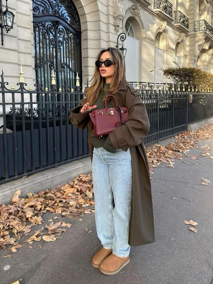 Earthy sophistication comes through here: an oversized olive coat layered with a green sweater, pale blue winter jeans, and platform chestnut Uggs. What sets it apart is the deep red handbag, breaking the earthy tones in the best way. This ensemble is ideal for women seeking winter casual chic with a modern twist.