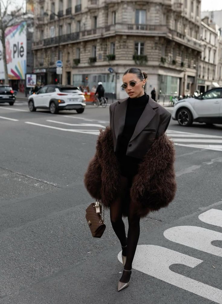 Chocolate brown blazer-style coat with fur sleeves: a bold, luxe statement.