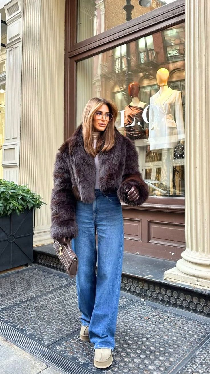 I’d add a structured bag in black or red to anchor the look. I’d skip over-accessorizing since the fur already steals the scene. This outfit benefits from confidence more than extra sparkle.