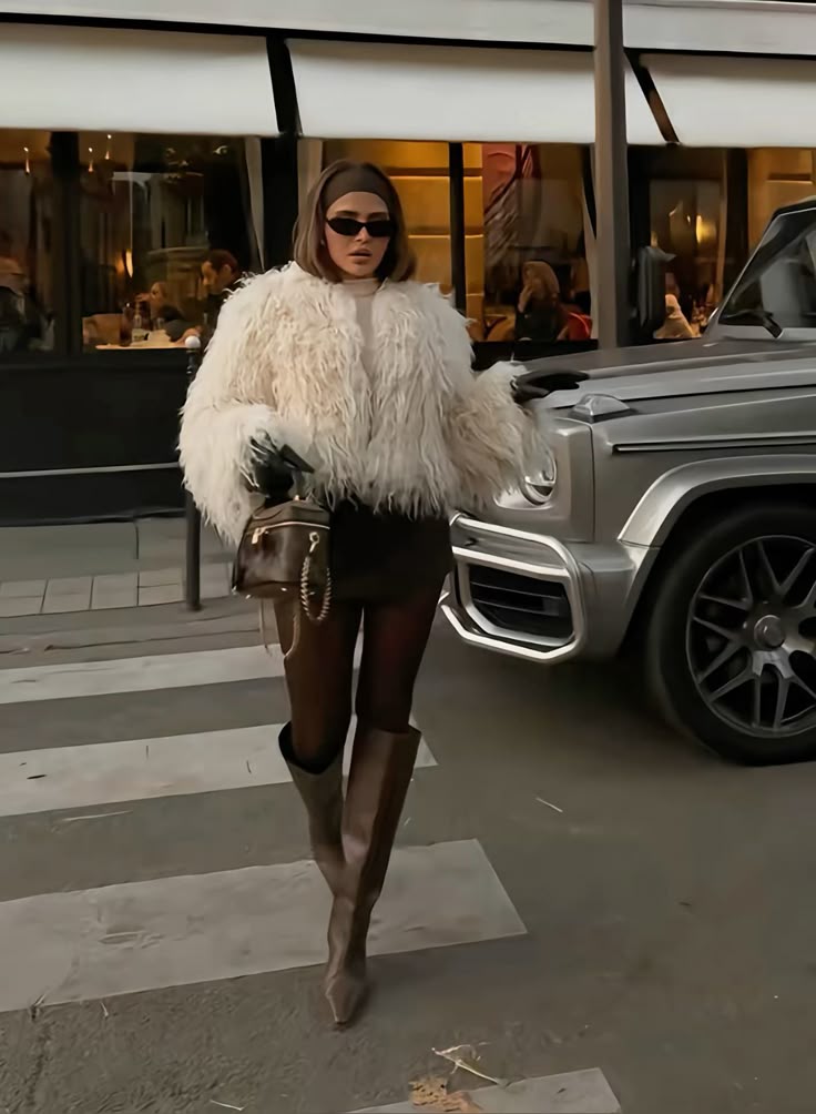 For those who want women classy sophistication with a hint of drama, this fur-trimmed brown coat outfit feels like pure Paris chic. It’s perfect for a dinner birthday celebration or even a winter photoshoot. The rich textures add warmth, making it practical for women winter nights outdoors. It works best on slim or hourglass body types since the oversized coat paired with tights creates contrast and structure.