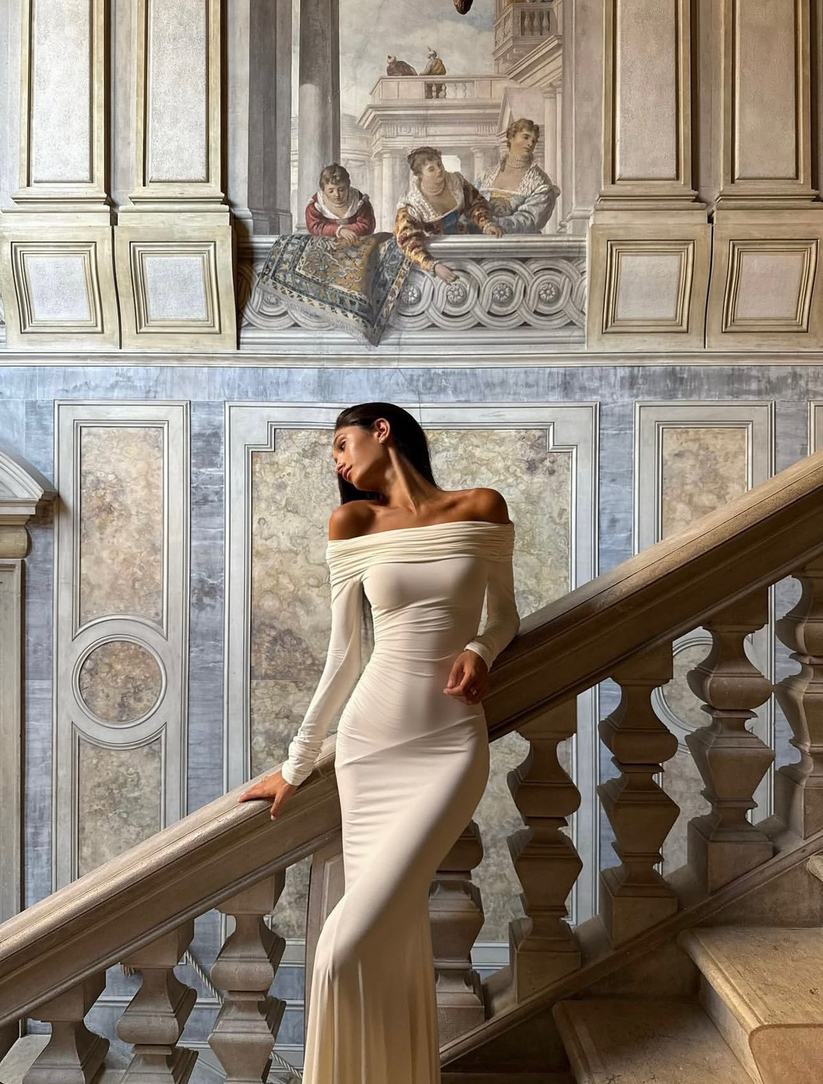 For milestone birthdays like a 21st or 25th, nothing makes an entrance like a sweeping off-shoulder white gown. This look is classy, regal, and timeless. It flatters taller frames and those with hourglass or athletic silhouettes, though petite women may feel swallowed by its length. It’s ideal for black-tie dinners, luxury party venues, or even photoshoot moments that capture elegance. Definitely not suited for school, simple outings, or casual dinners.