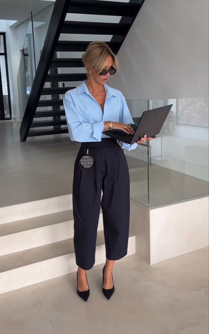 The look is defined by clean tailoring—an oversized powder-blue button up shirt tucked into high-waisted pleated black trousers. It’s a power move for women business casual, sharp enough for meetings yet flexible for everyday work. The cropped length of the pants paired with pointed pumps keeps the silhouette light, perfect for Wednesday casual days when you want elegance without overthinking. This works beautifully on taller women with longer legs, though petite figures may want slimmer trousers to avoid being overwhelmed.