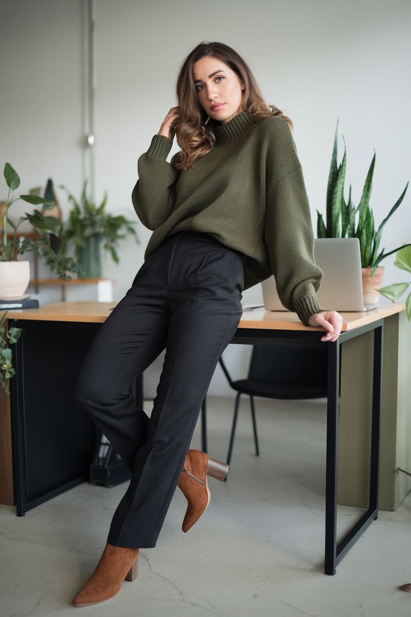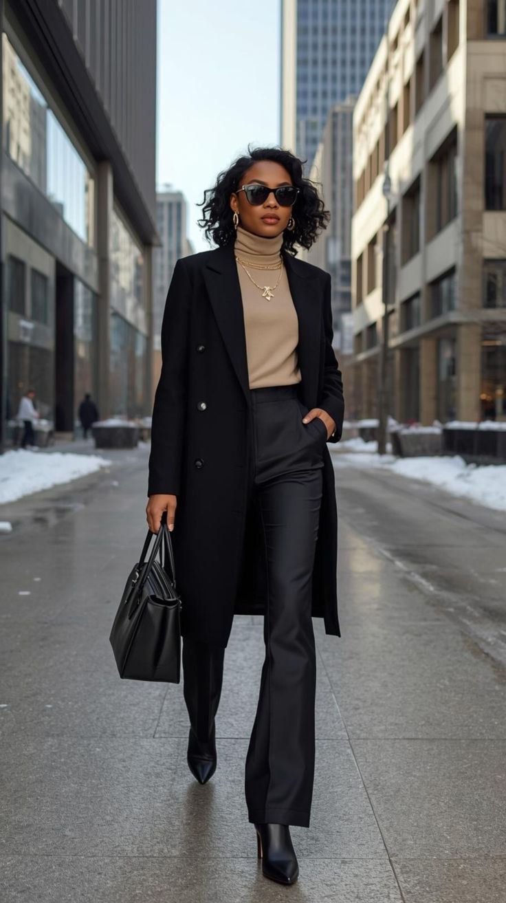 A deep green tailored coat instantly modernizes women winter office outfits women cold. Worn over a sleek black turtleneck and dark cuffed jeans, it’s a casual yet elevated take on attire women business casual. Perfect for creative workplaces or Wednesday casual dress codes. Flattering for women with straighter figures, since the belt line defines the waist and the jeans add structure.