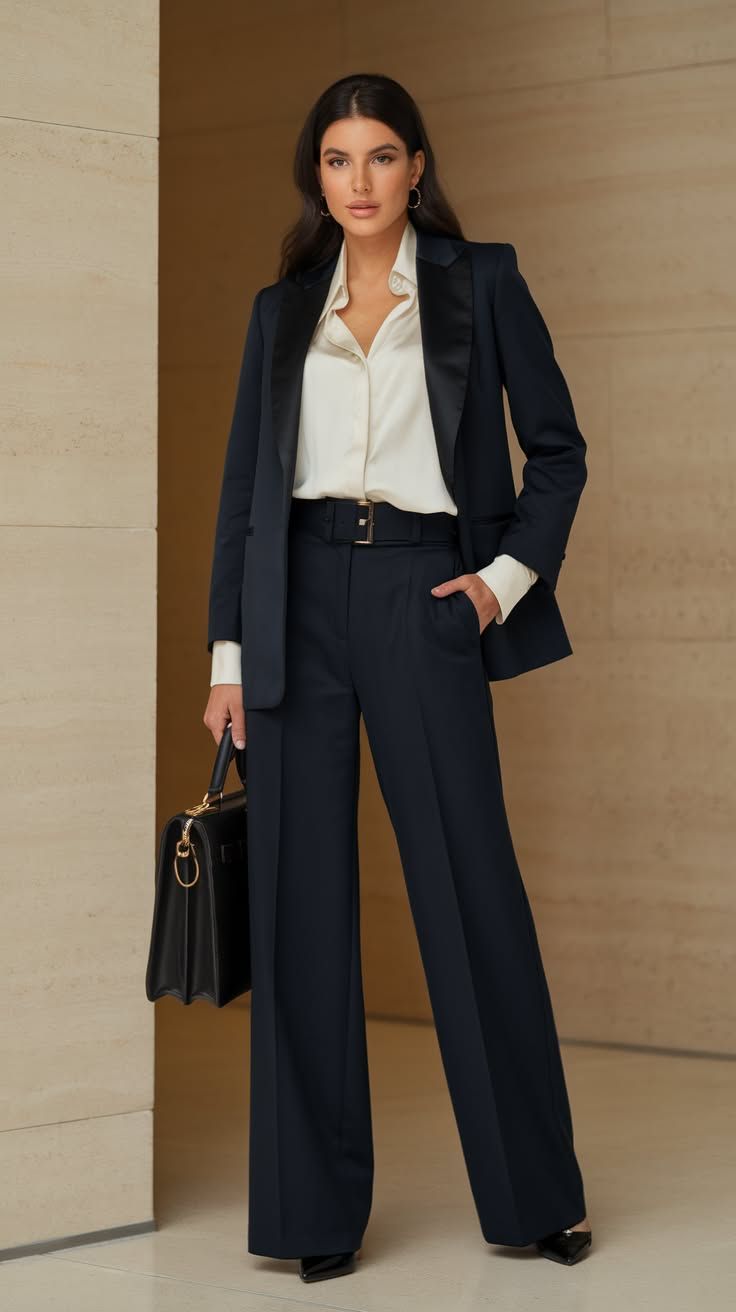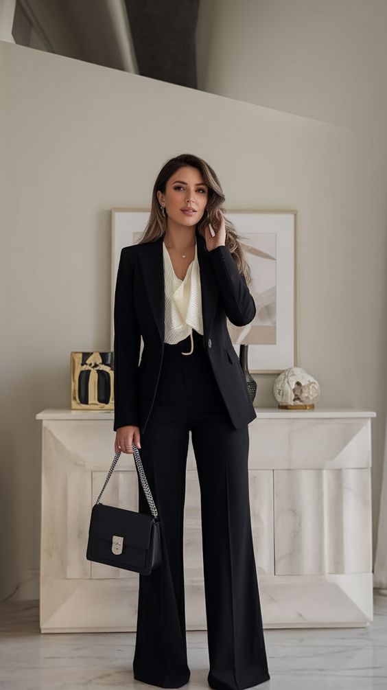 Finally, the forever classic: a tailored black suit with a silky ivory blouse. This is women business classy at its peak—a modern take on wear classy business attire that works across industries. Perfect for high-profile meetings, conferences, or even a chic party dinner. Universally flattering thanks to long lines and soft draping.
