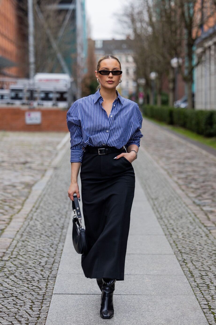 This style leans into business casual chic with a navy striped button up shirt tucked into a long black skirt, cinched at the waist with a sleek belt. It’s a structured yet fluid option for work settings where women business attire is expected but not overly formal. It’s especially flattering for women who want to elongate their frame, as the vertical lines add length and the midi hem creates balance.