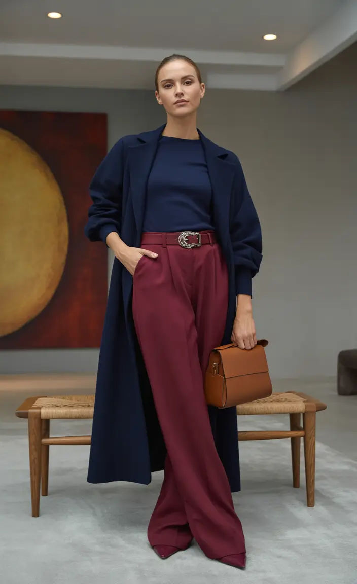 To make it winter-appropriate, I’d layer a wool coat or tailored blazer. I’d avoid overly chunky cardigans—they would disrupt the lean vertical flow.