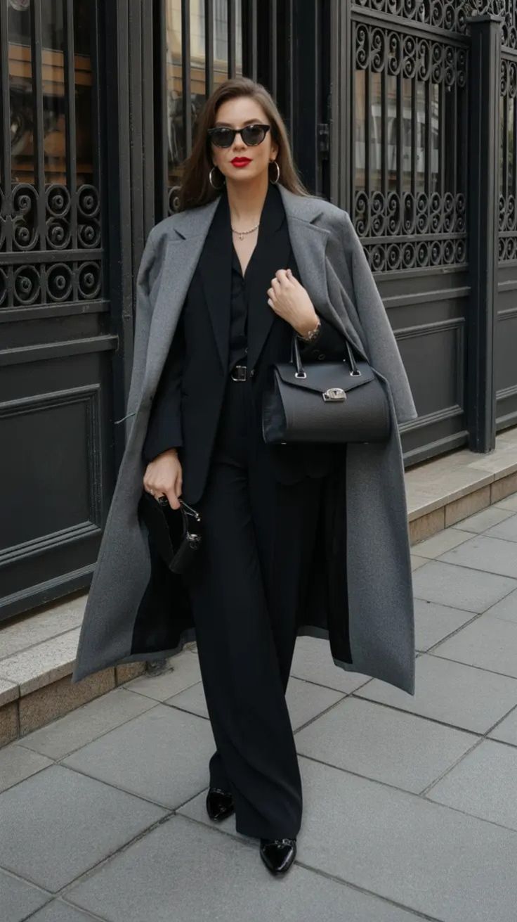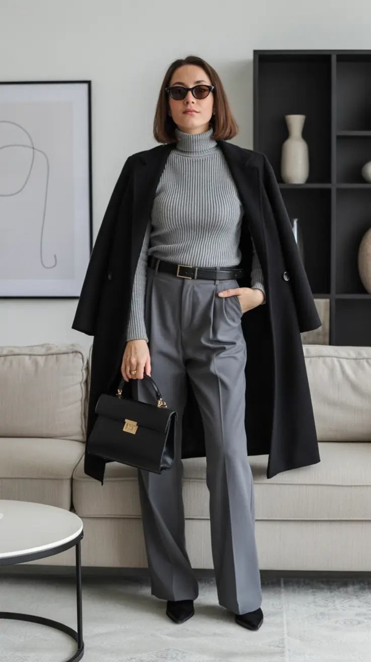 This outfit is the definition of wear classy business attire—grey tailored trousers, a ribbed grey turtleneck, and a sharp black coat draped over the shoulders. It works across body types thanks to clean lines and structured fabrics. A perfect formal dress for men parallel would be a tailored charcoal suit: crisp, reliable, and always elegant.