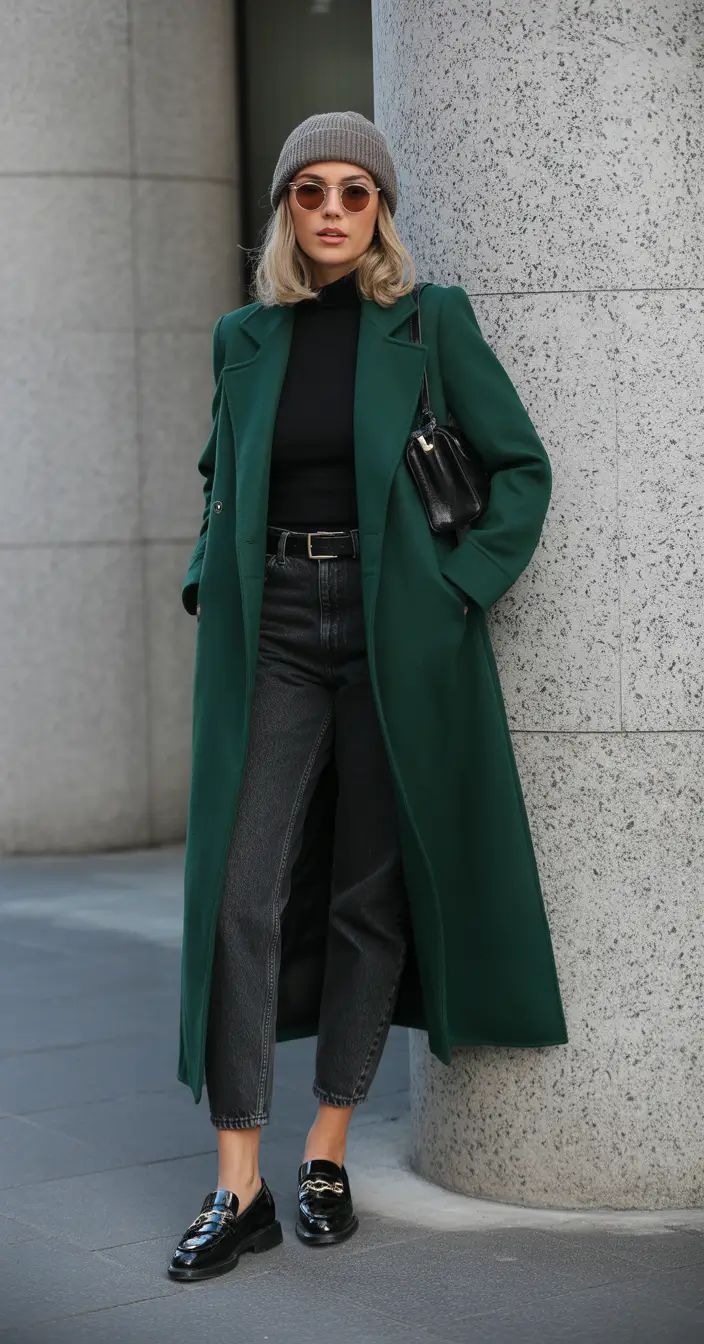 Long green coat: a bold statement for smart casual women.