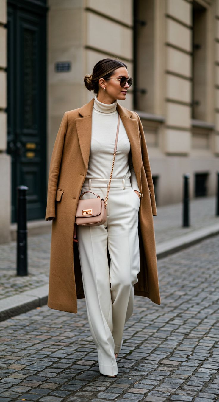 Few combinations say for women business classy more than camel and white. A structured camel coat layered over a cream turtleneck and tailored ivory trousers feels polished yet approachable. This look shines in business casual settings but works equally well for party dinners post-work. Ideal for women who prefer modest fashion without losing edge.