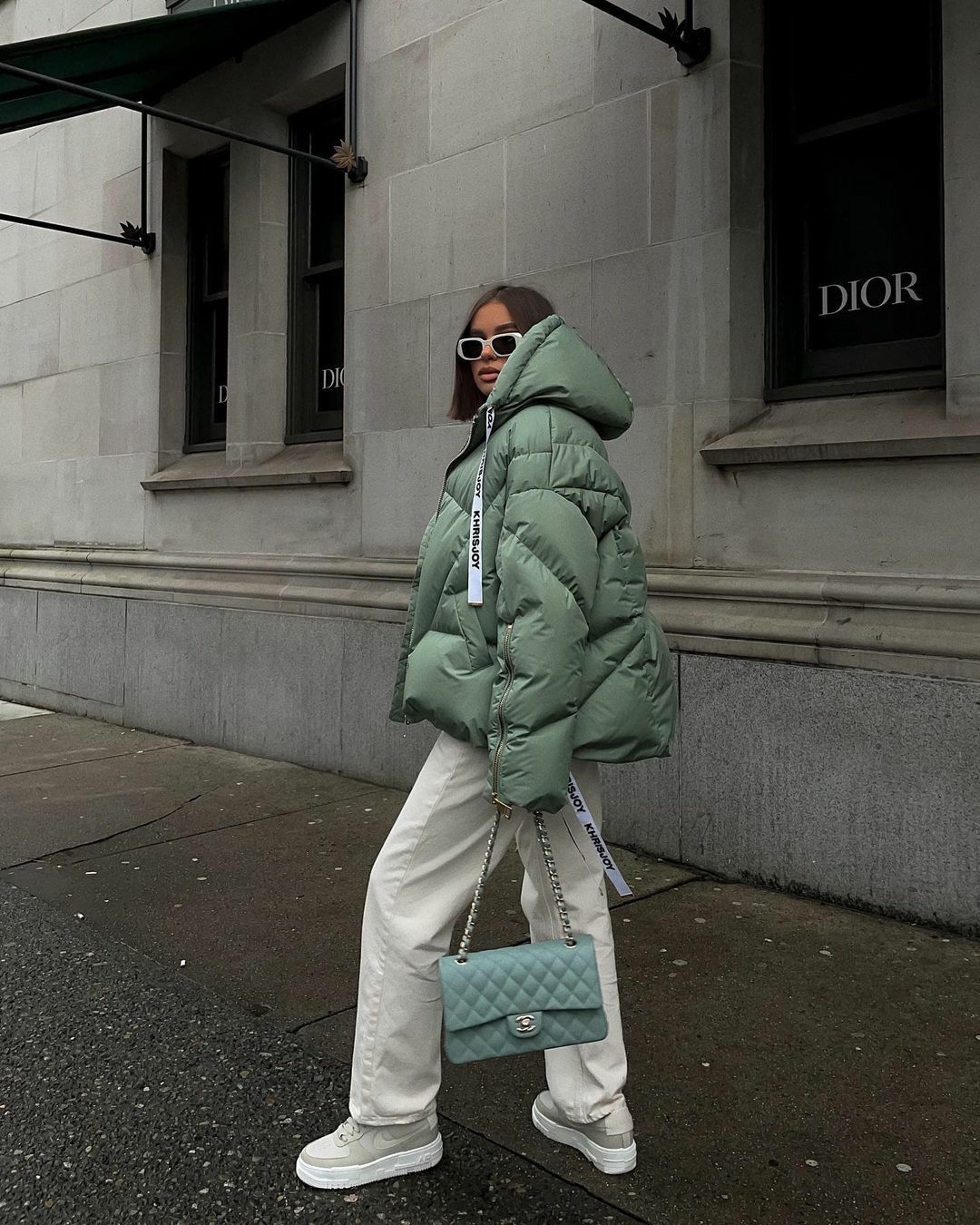 The oversized mint puffer coat steals the spotlight with its modern, voluminous silhouette. This style works beautifully for taller women or those who love a streetwear aesthetic—its cropped hem at the hip prevents the jacket from overwhelming the figure, but petites might feel slightly drowned by the puffiness. Paired with ivory straight-leg pants and tonal sneakers, the outfit channels modest luxury while staying practical for cold weather strolls in the city. The quilted Chanel bag in soft green ties everything together in a monochromatic palette that feels both cute and refined.
