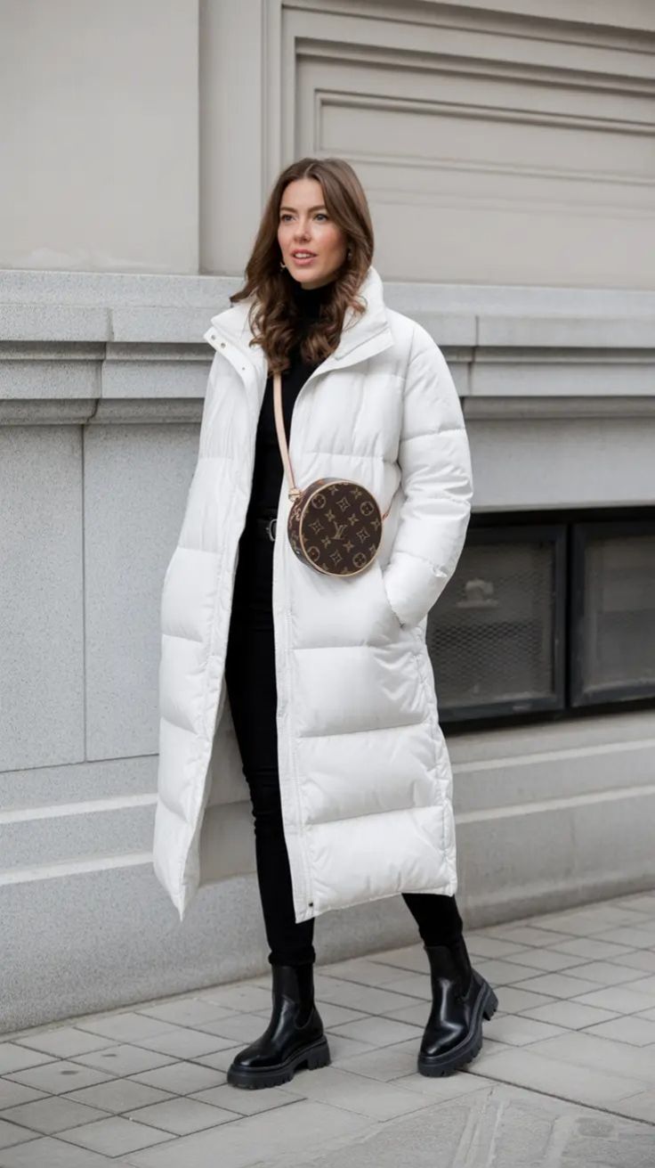 This white long puffer coat styled with a black turtleneck, slim pants, and Chelsea boots feels refined and sleek. It’s chic enough for city days yet warm enough for snow. Perfect for women who lean toward modest yet powerful looks. The longline cut works best on medium-to-tall figures for proportion balance.