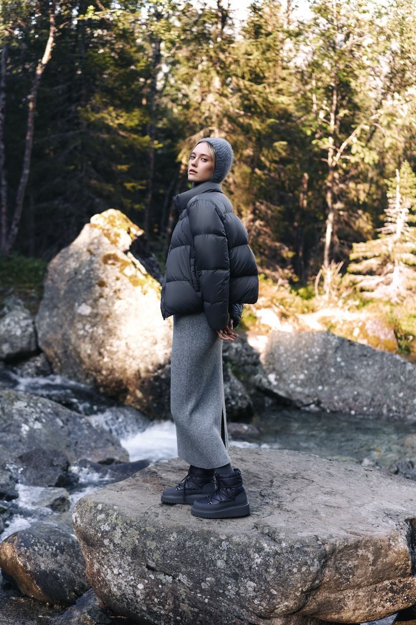 Leggings: slim fit to balance the puffed silhouette, ideal for mobility in the cold.