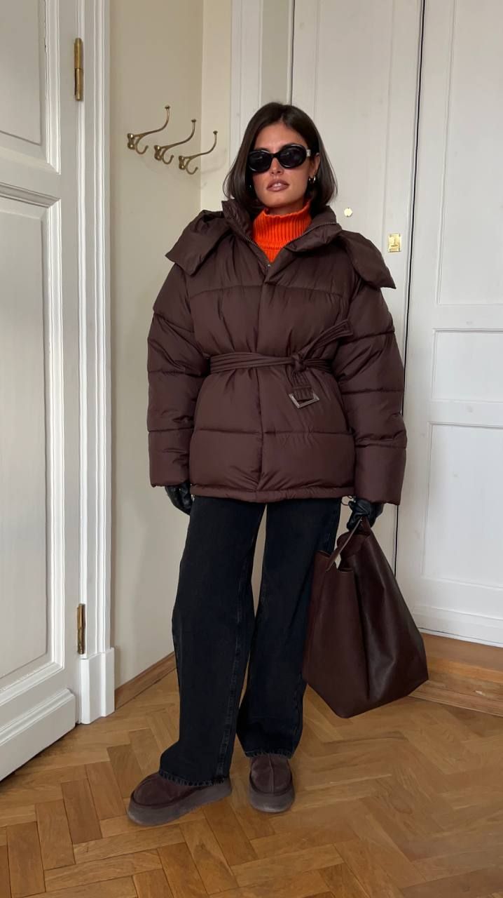 This brown belted coat-style puffer channels quiet luxury with a hint of power dressing. The cinched waist defines the silhouette, making it flattering on hourglass or rectangle body shapes. The bright orange knit underneath introduces a red-toned warmth, breaking up the monochrome base. This outfit works perfectly for city commutes or business lunches in 2025, less so for heavy snow days when slush demands waterproof boots.