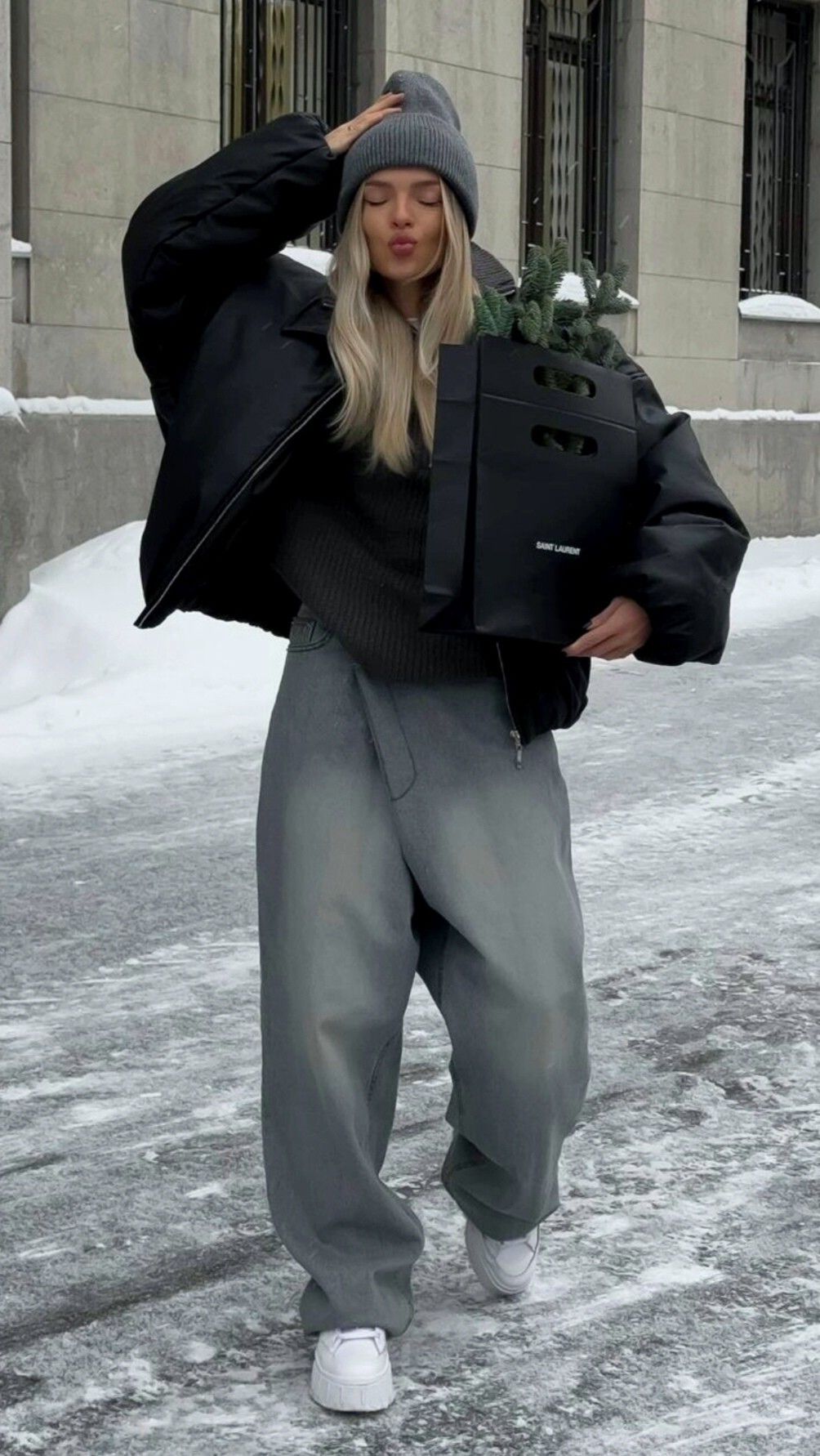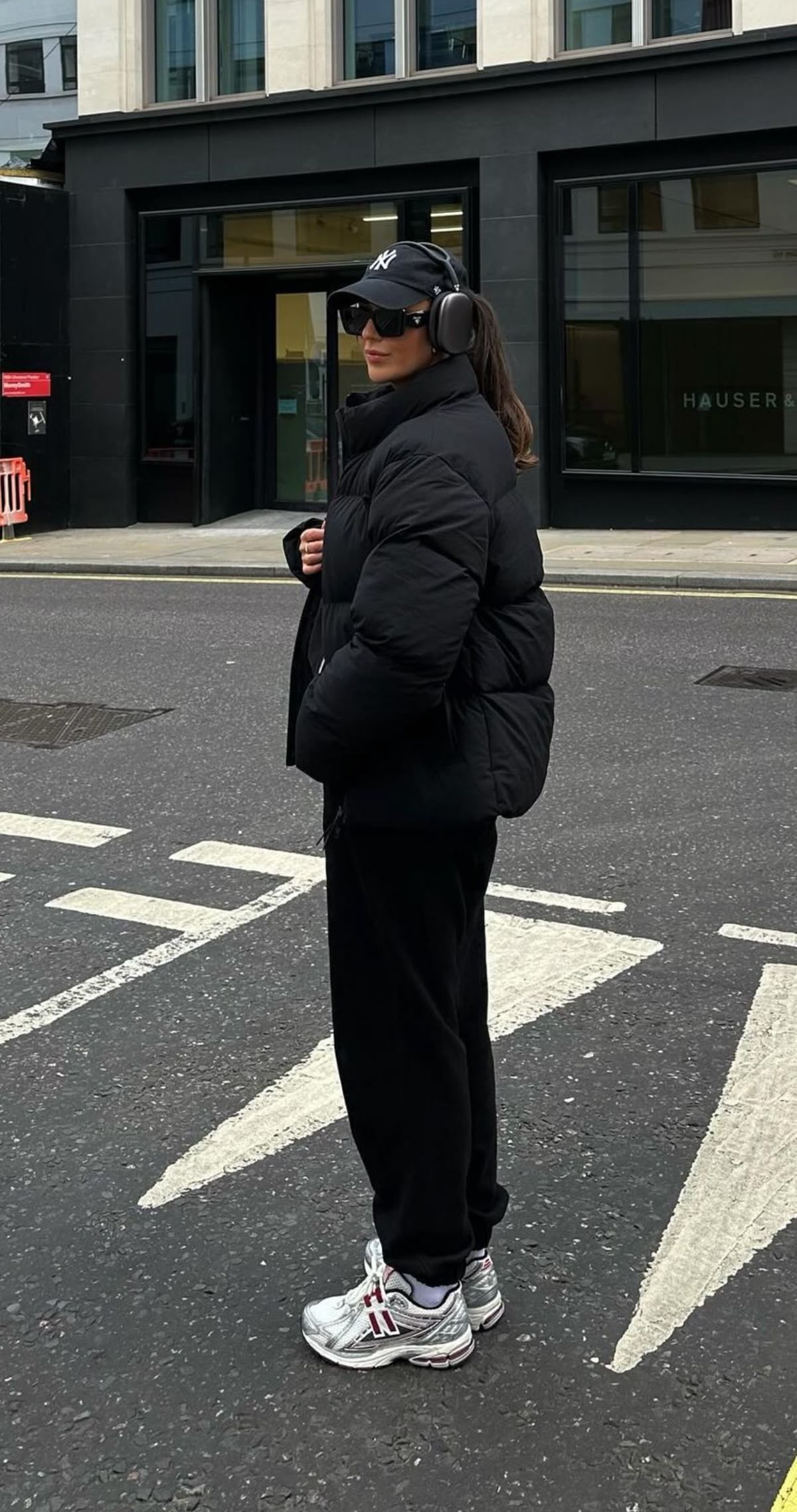 Here’s pure streetwear inspo: an all-black look styled with headphones, a baseball cap, and chunky sneakers. It screams 2024-meets-2025 urban cool. This look flatters most body types because it’s all about comfort and attitude. It’s perfect for city walks, casual errands, or catching a coffee with friends. But in snow, those sneakers may not cut it—switch to insulated boots for true winter practicality.