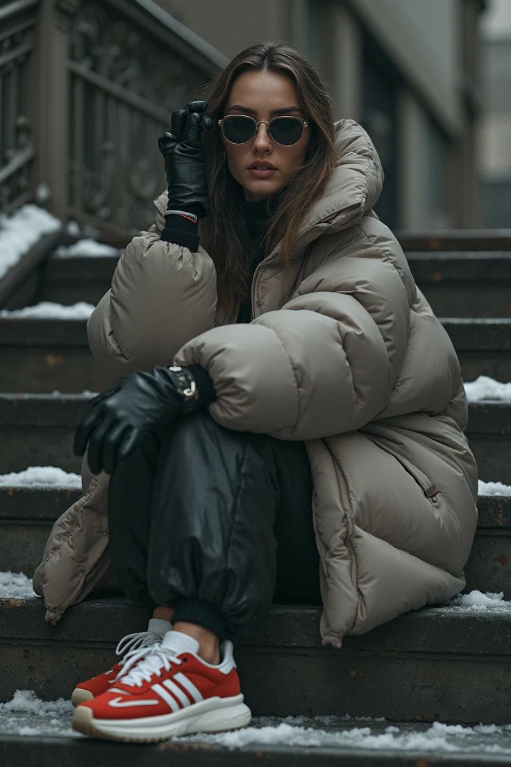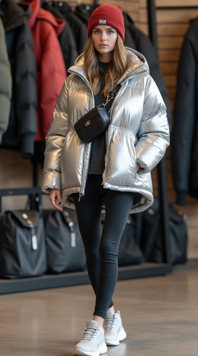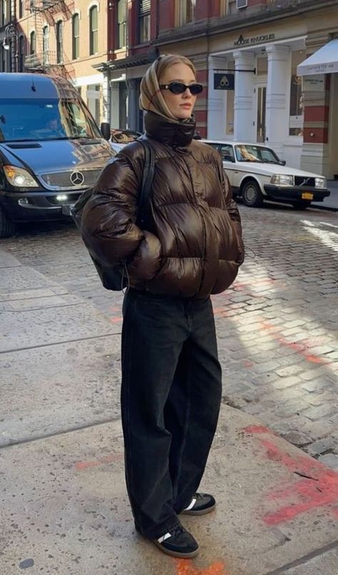 This short brown glossy puffer brings a 2000s revival moment. With wide-leg pants and a retro scarf, the look screams streetwear chic. Best for taller figures since wide trousers plus puffers can overwhelm smaller frames. It’s excellent inspo for street styles in 2025-2026, especially for anyone who loves layering accessories. Less practical in heavy snow, but perfect for city strolls.