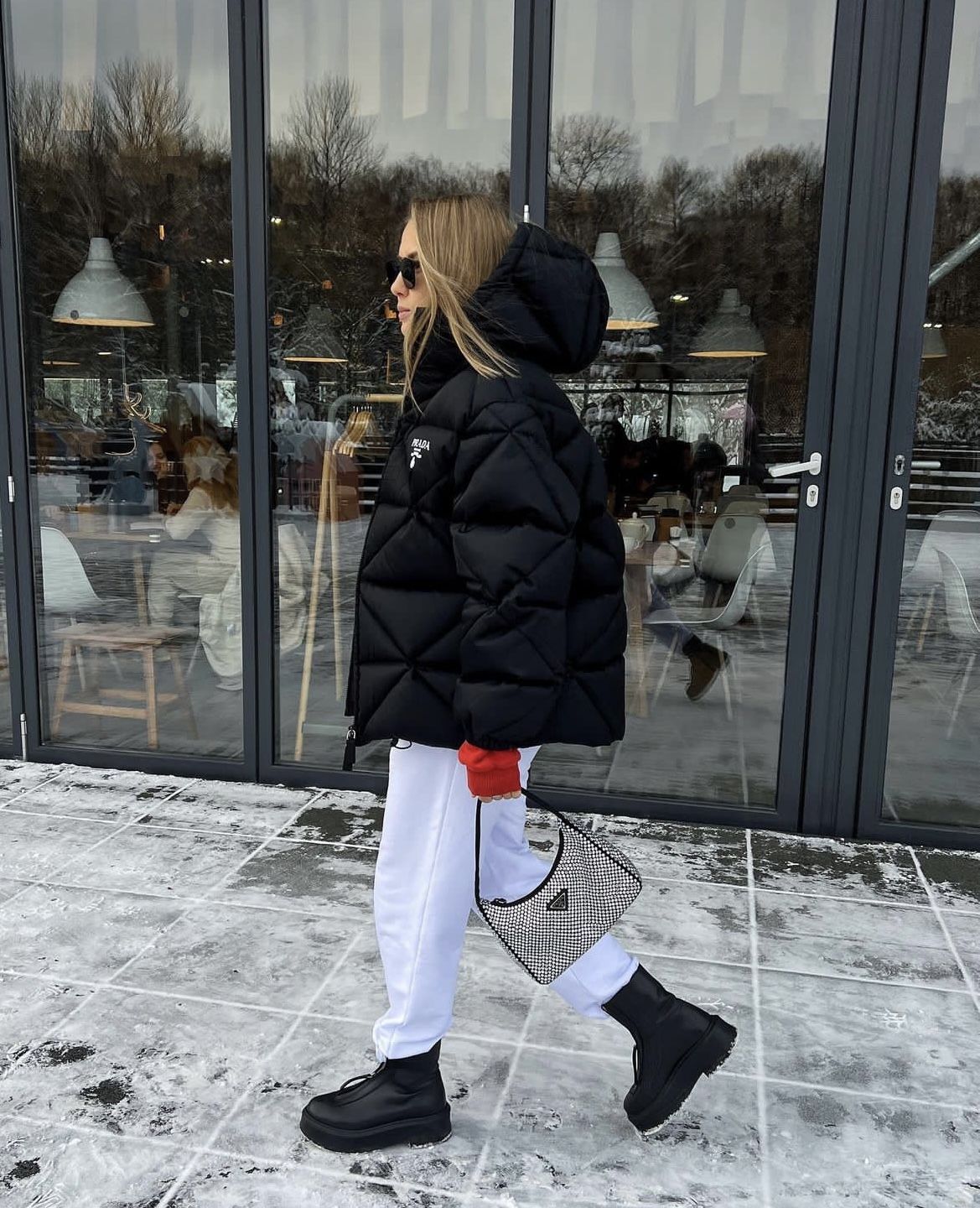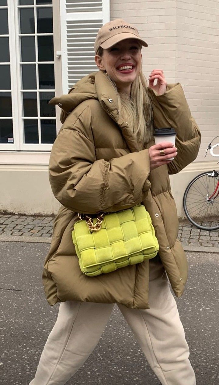 A muted khaki-brown puffer paired with white joggers and a bold green woven bag feels fresh and effortless. This outfit works for weekend coffee runs, travel days, or street styles that prioritize comfort. The oversized shape balances well with slim joggers, making it wearable for most body types.