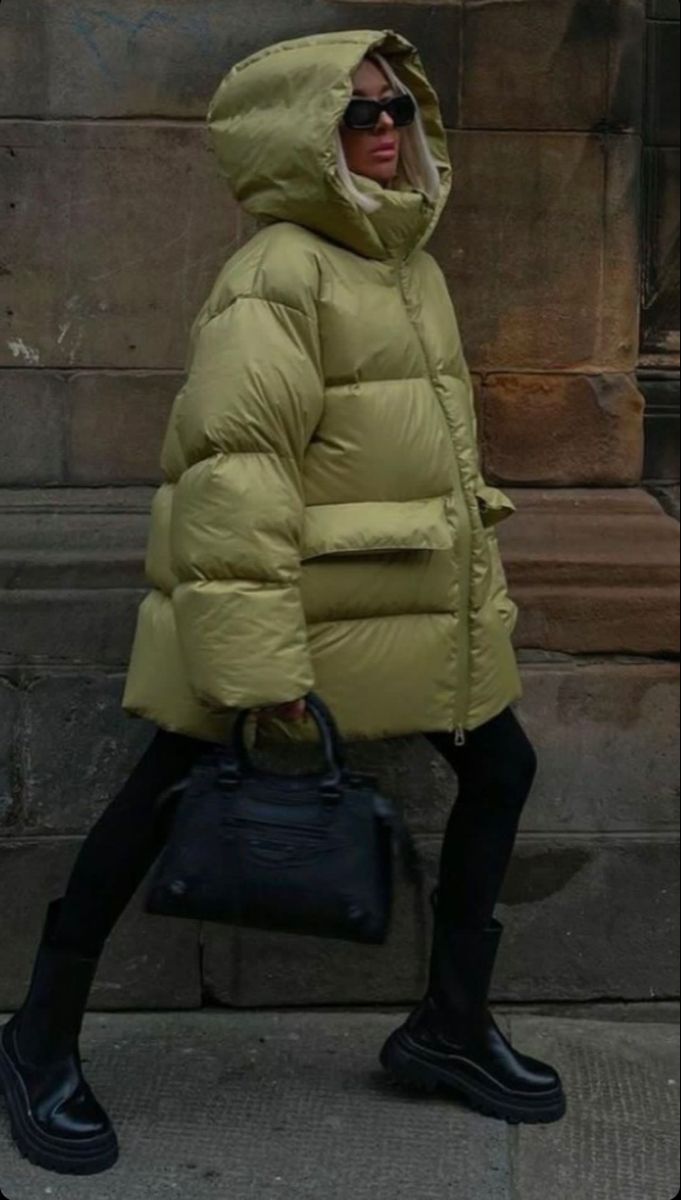 The oversized green puffer with a hood takes the oversized trend to new heights. Styled with black tights and boots, it’s dramatic yet undeniably practical. This works especially well for taller women or anyone embracing modest silhouettes. It’s fabulous for cold city days, less so for formal outings where tailoring is key.