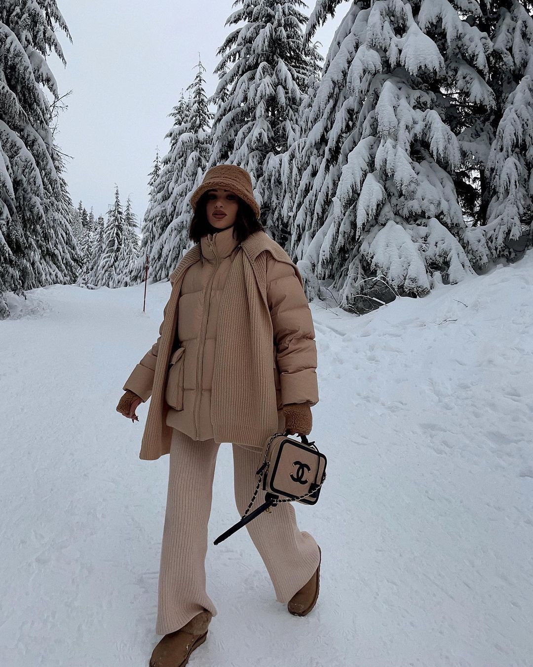 Head-to-toe beige never looked so luxe. The tonal puffer, knit pants, and matching gloves scream quiet sophistication. This look works well for taller women since elongated flares lengthen the silhouette. It’s ideal for snowy forest walks, city weekends, or casual dinners. Not as practical for slushy streets though—the light tones are unforgiving in dirt.