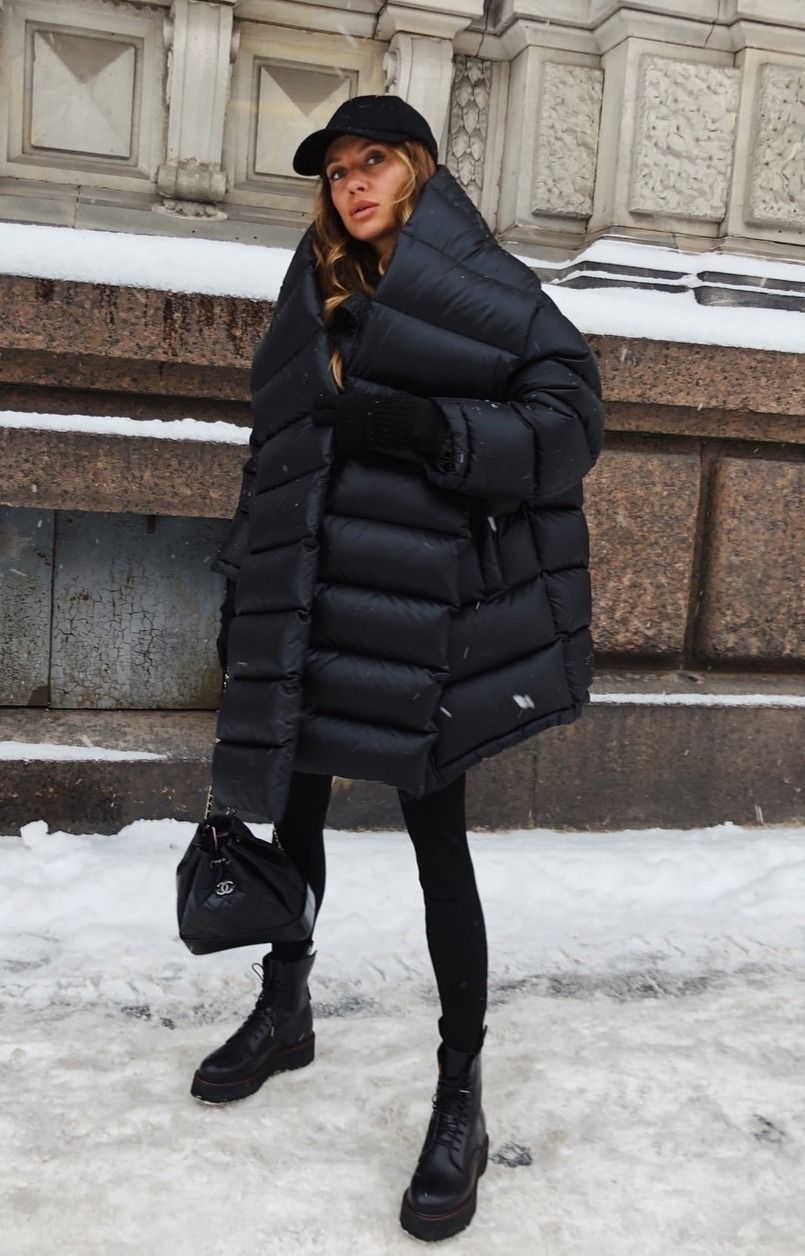 Black oversized puffer jacket: exaggerated quilting, cocoon effect, and dramatic proportions.