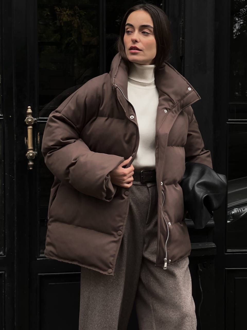 Khaki-brown puffer: oversized, modern, slouchy in the best way.