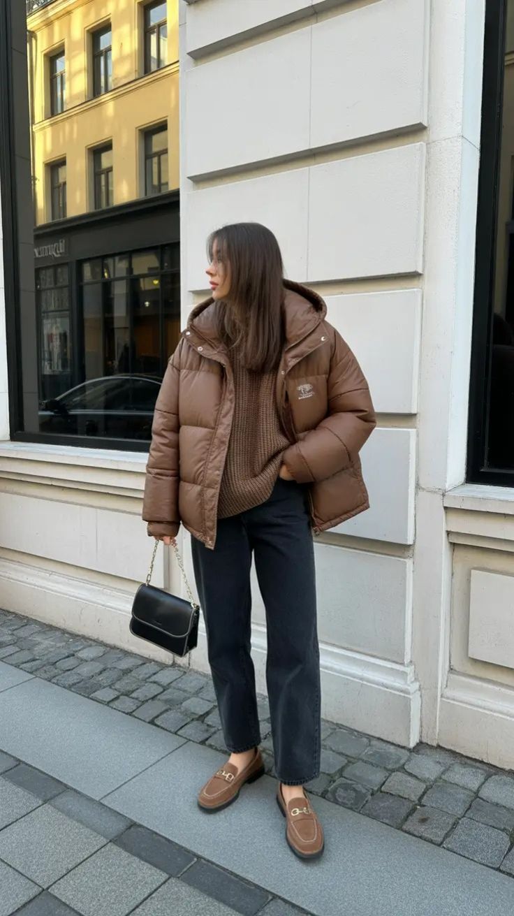 This brown puffer jacket layered over a chunky knit sweater feels like the ultimate winter coat for women craving everyday elegance. The clean pairing with charcoal denim and loafers strikes a sweet spot between street styles and casual chic. It’s practical for everyday wear—walking the city, meeting friends, or errands. The boxy cut flatters most body types, though very petite frames may prefer a slightly shorter jacket to avoid being overwhelmed.
