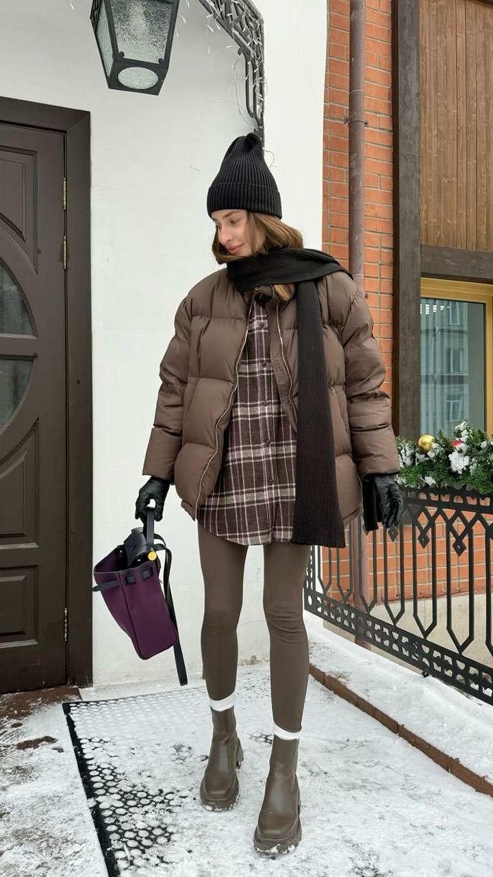 The brown puffer with a plaid shirt dress and taupe leggings feels like street styles meets cozy cabin living. Perfect for snowy weekends in the countryside or chalet vibes, but less suited for polished citywear. The playful proportions flatter leaner body types, while the chunky boots balance the oversized top layers.
