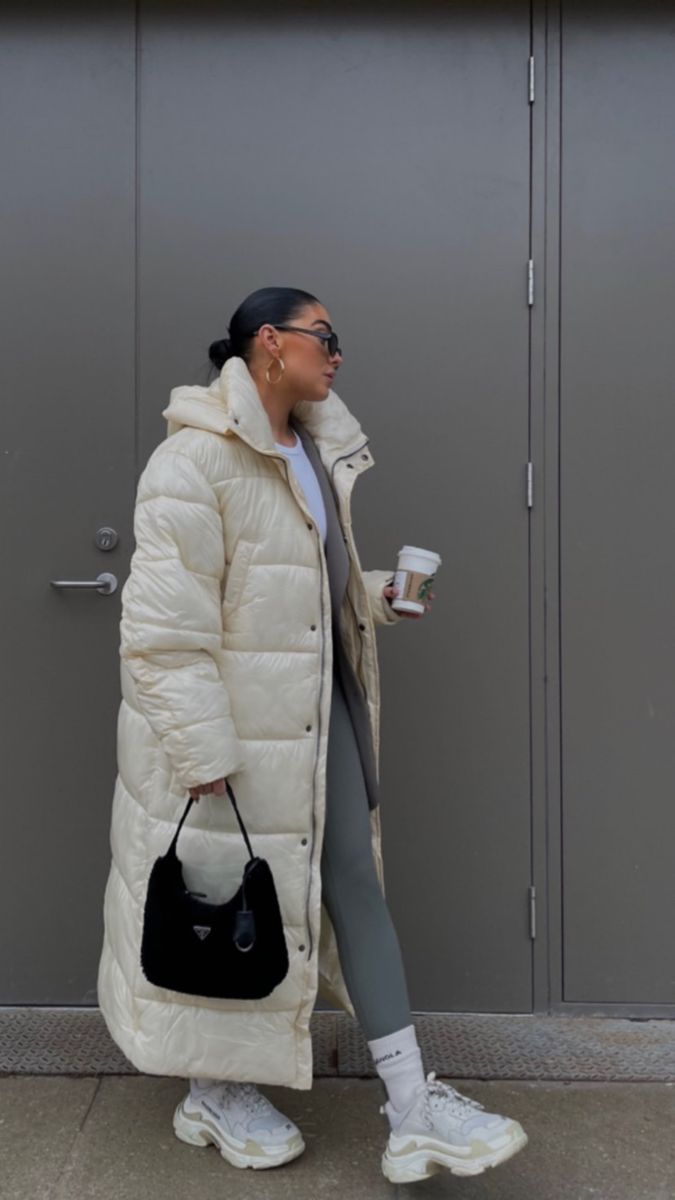 This white long puffer exudes quiet luxury. Its ankle-length cut makes it a dramatic choice for cold weather, cocooning the body in plushness. Styled with gray leggings, chunky white sneakers, and gold hoops, it screams modern streetwear with an edge. Perfect for urban strolls, shopping, or casual brunches. Its long structure flatters taller silhouettes but can overwhelm petite women.