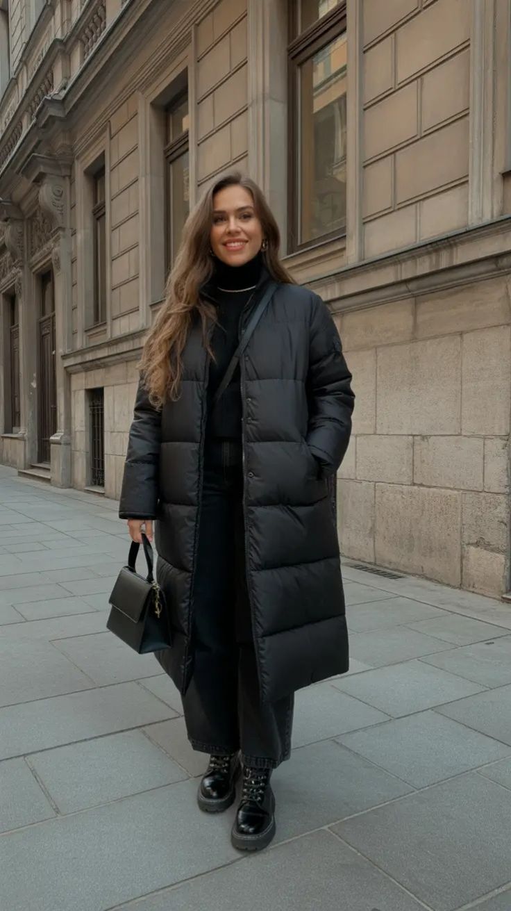 The combination of a voluminous charcoal puffer and a floor-length knit skirt offers a modest yet modern silhouette. This outfit is made for alpine escapes or winter strolls through quiet towns. Its lengthening effect works beautifully for taller women, though petite figures may feel overwhelmed by the long hemline. Still, the overall style blends practicality with elegance, proving that cold-weather dressing doesn’t have to sacrifice softness.