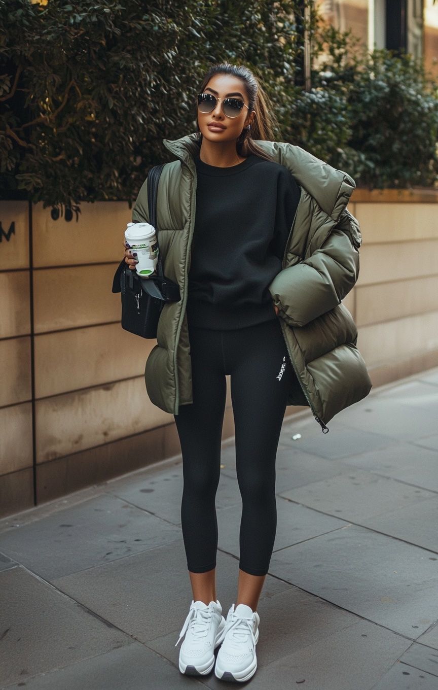 Here, a forest green puffer meets black leggings and a simple sweatshirt—a masterclass in streetwear styling. This style Korean fashion-inspired combo feels modern, active, and practical for chilly city days. It’s flattering for athletic or hourglass frames thanks to its cropped proportions. Perfect for casual meetups, coffee runs, or post-gym strolls.
