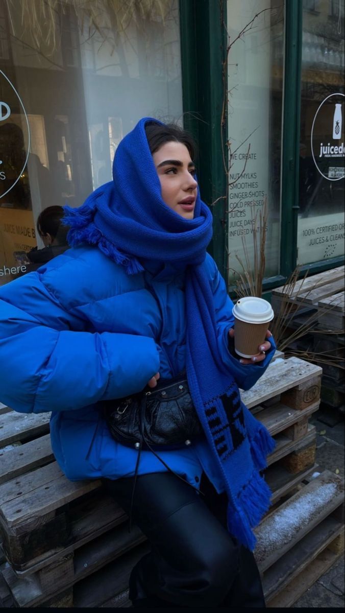 A saturated blue puffer jacket paired with a matching oversized scarf feels daring and unapologetic. This is the definition of street styles inspo for 2025: dramatic, playful, and statement-making. While not everyone’s everyday choice, it’s perfect for women who want to stand out against gray city streets. Works best on taller frames who can carry the bulk of the fabric.