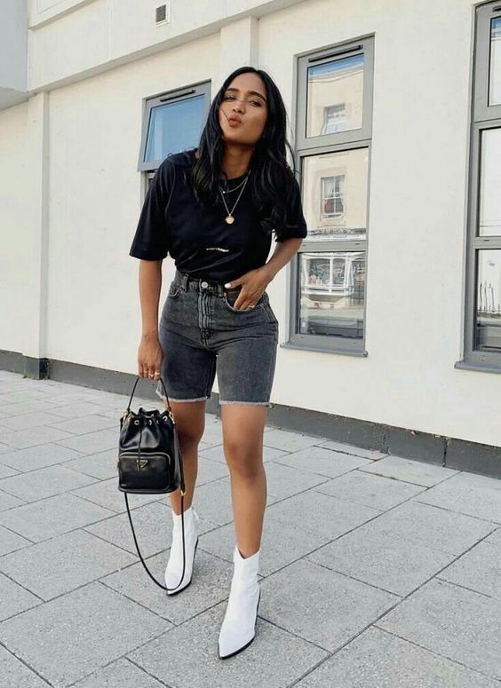 Denim shorts are back — but not the cutoffs of the past. This version feels urban, confident, and perfectly casual. A relaxed black tee paired with structured denim half pants creates balance, while white ankle boots modernize the silhouette. This works across ages, including 40 and beyond, if the fit is right. Great for city days, travel, and casual meetups — not designed for formal settings.