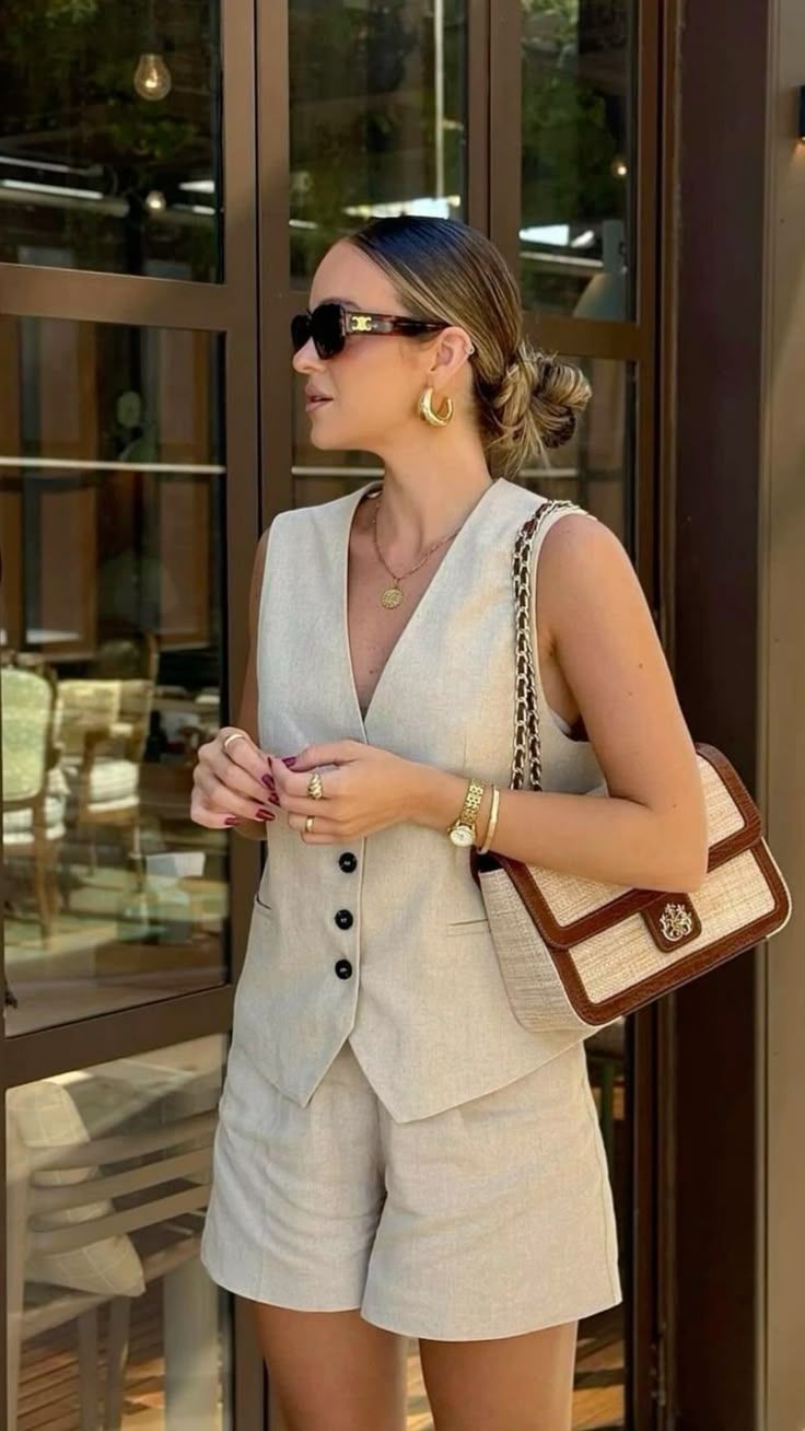 This look leans into a softly tailored direction that feels polished without tipping into stiffness. The pastel shorts sit high on the waist, paired with a matching sleeveless vest that creates a clean vertical line. It’s especially flattering for straight and hourglass figures thanks to the structured waist and open neckline, while those who prefer more coverage through the arms may feel less comfortable here. Practically, this outfit works beautifully for city days, creative office environments, or warm-weather meetings — but it’s less suited for very formal corporate settings.