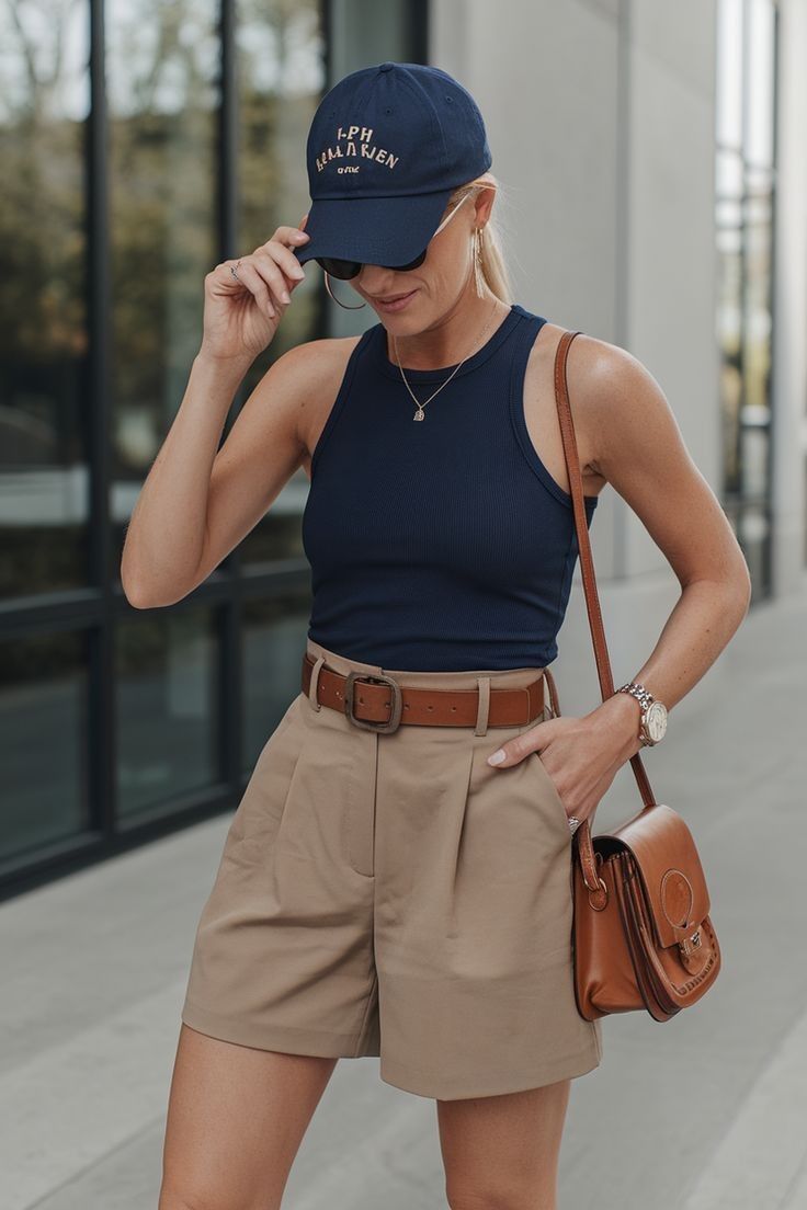 This look balances casual summer confidence with subtle structure. A fitted neutral tank is tucked into tailored, high-waisted light shorts, cinched with a belt for definition. The baseball cap and sunglasses keep it firmly in casual street styles, while the clean lines of the shorts elevate the outfit beyond weekend basics. This works beautifully for athletic or straight figures; curvier shapes may prefer a slightly longer inseam for comfort. It’s ideal for summer time city walks, outdoor lunches, or travel days — not quite right for formal settings, but perfect for everyday polish.