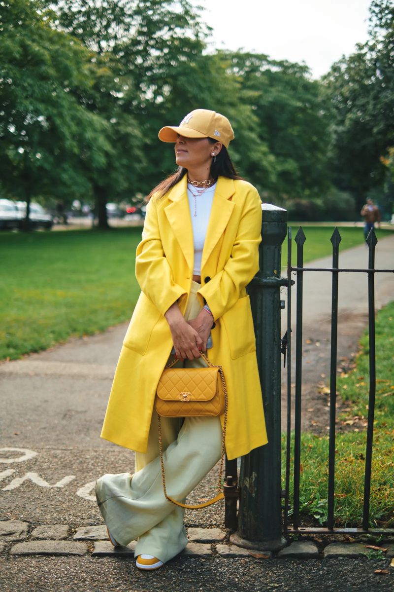 Yellow Bag: The quilted texture adds sophistication while matching the coat in tone for maximum cohesion.