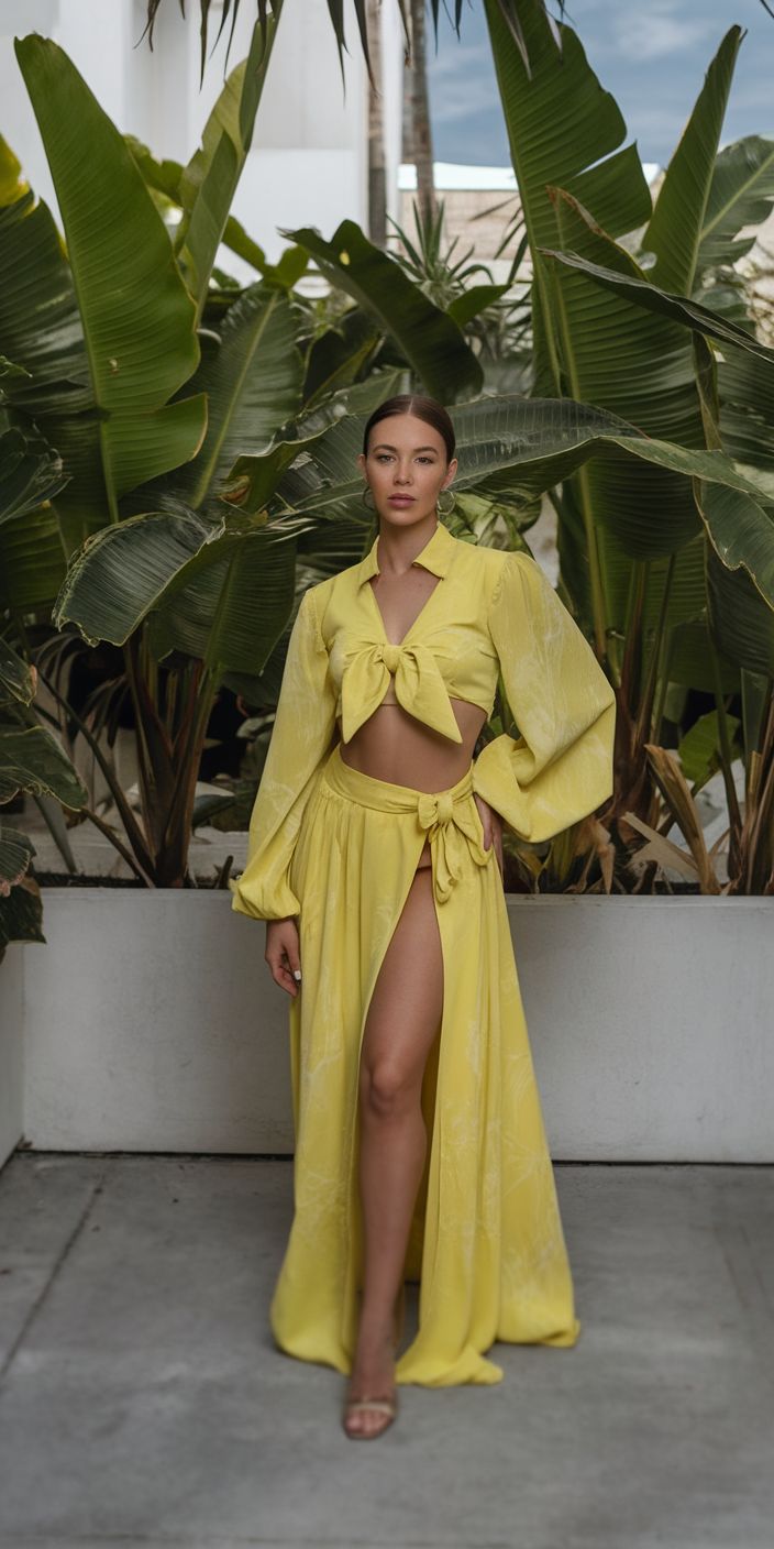There’s a certain resort glamour in this ensemble—a buttery pastel two-piece with knotted detailing, billowy sleeves, and a sweeping skirt that moves like air. This is the definition of soft, feminine confidence. Perfect for hourglass or pear shapes because the tied crop and high-slit skirt draw the eye upward while elongating the legs. It’s a dream for vacations, warm evenings, or beach-side dinners, though not ideal for cooler climates or highly structured events.