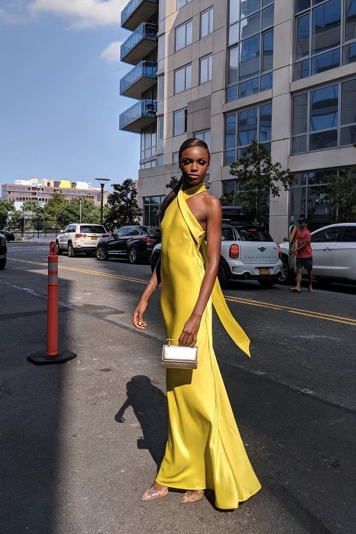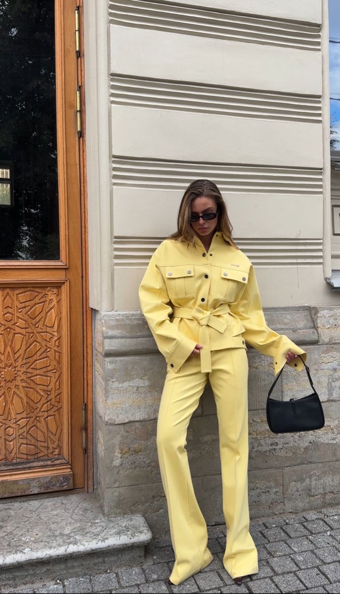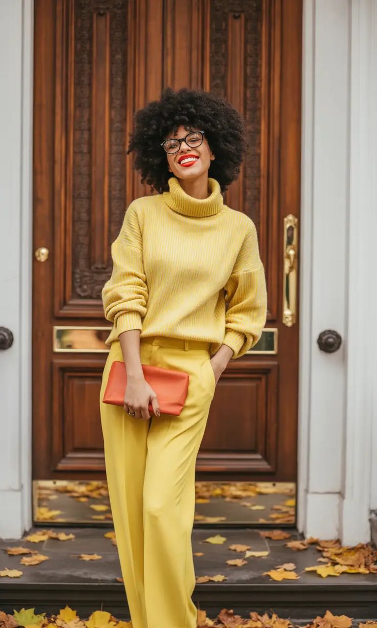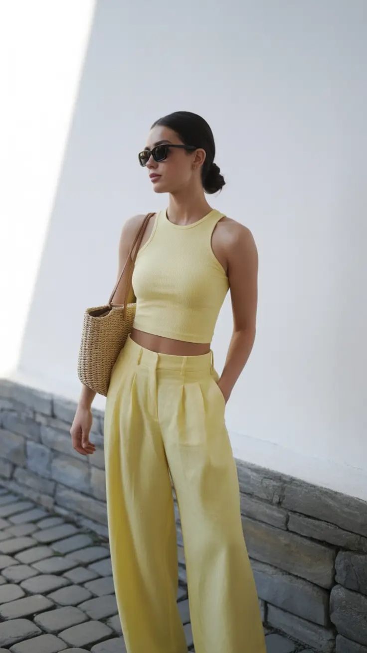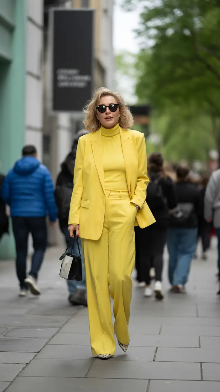 Here’s a lesson in tonal elegance: a lemon turtleneck knit paired with wide-leg trousers in a slightly deeper yellow. This look works beautifully for tall or elongated figures, as the monochrome vertical line enhances height and fluidity. Perfect for daytime events, lunch dates, or even a warm autumn look. Less suitable for humid summers due to the heavier knit.