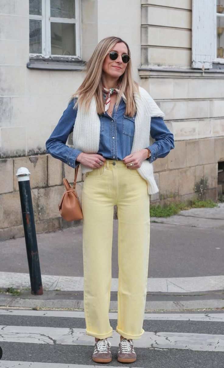 Denim shirt: the ideal partner for pale yellow bottoms, creating a subtle blue and butter contrast that feels chic.
