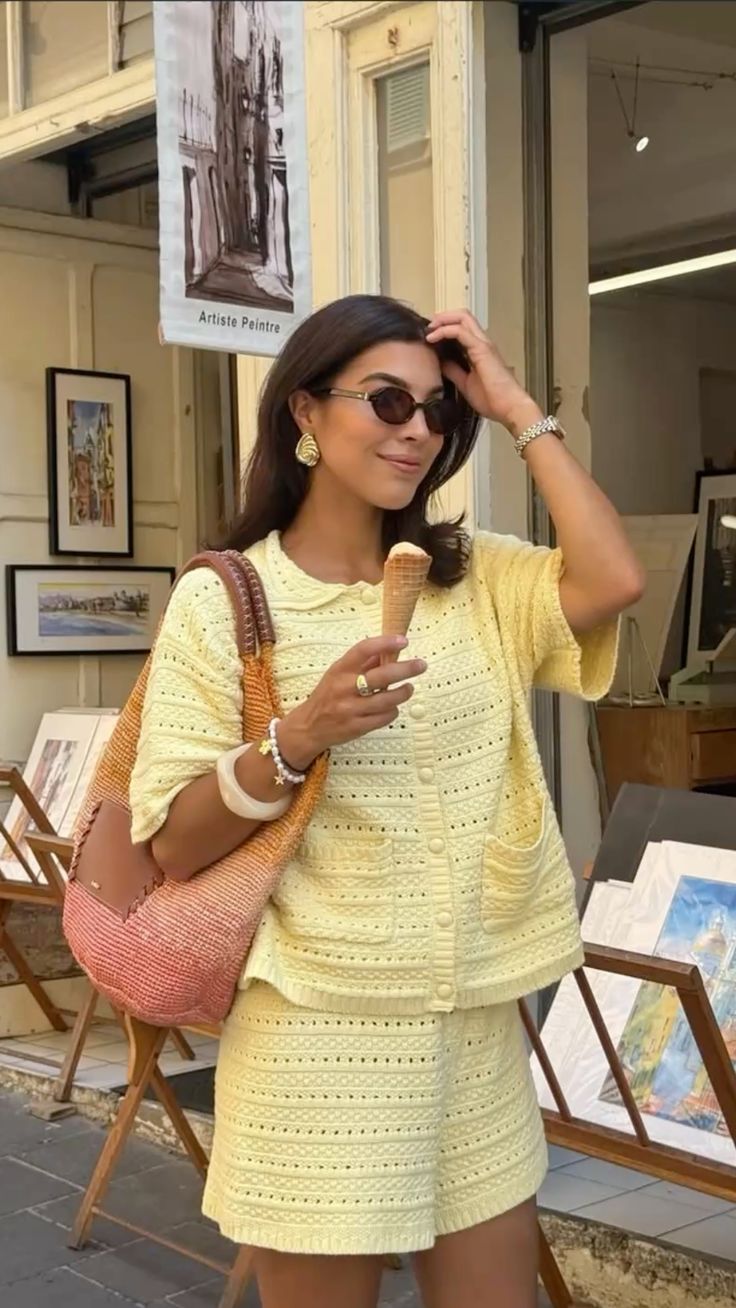 A matching crochet top and shorts in a butter shade feels like summer in its most nostalgic form. The open-weave texture and rounded collar bring a vintage sweetness that flatters petite and hourglass shapes especially well due to the defined waistline and coordinated silhouette. This outfit shines on warm days, travel strolls, or outdoor markets—but wouldn’t suit cold weather or ultra-formal outings.