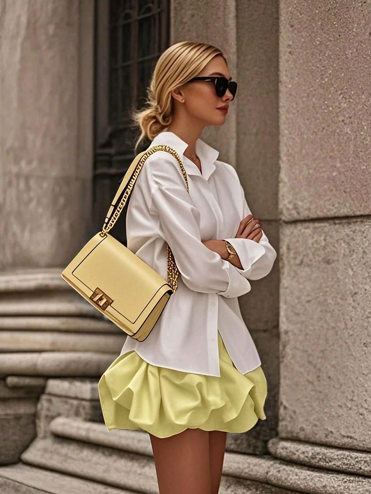 This combination brings together crispness and femininity: a sharp white shirt contrasts a ruffled pastel-lemon mini skirt. Ideal for inverted triangles or rectangles, as the skirt adds flirty volume to the lower silhouette while the top remains tailored. Works beautifully for city lunches, daytime events, or even a chic office with a creative edge. Not recommended for settings requiring conservative knee-length silhouettes.