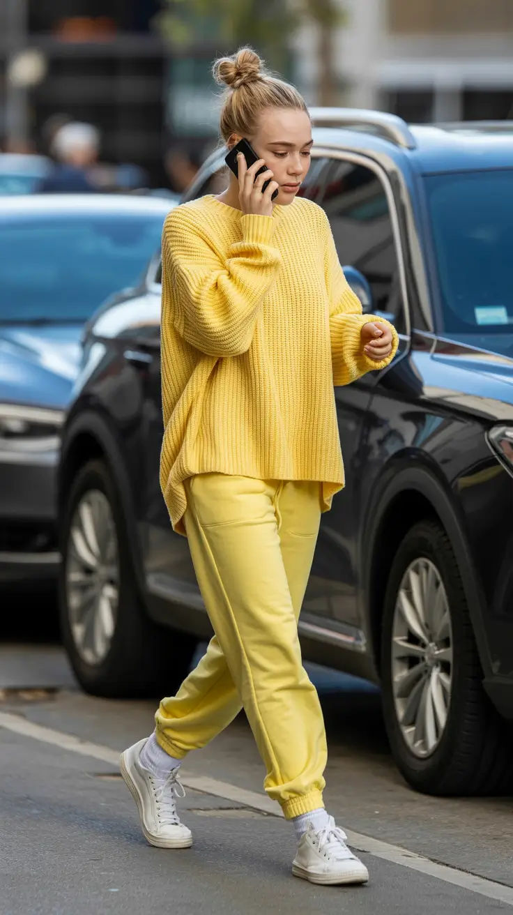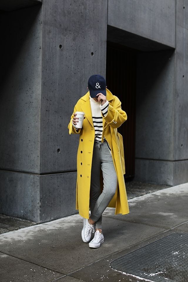 A bright long yellow coat over casual basics is the definition of elevated streetwear in 2026. This look flatters most shapes because the structured outer layer frames the body while the joggers maintain comfort. It’s great for travel, errands, or chilly city mornings. However, the coat’s saturation is best suited to those comfortable with high-impact color.