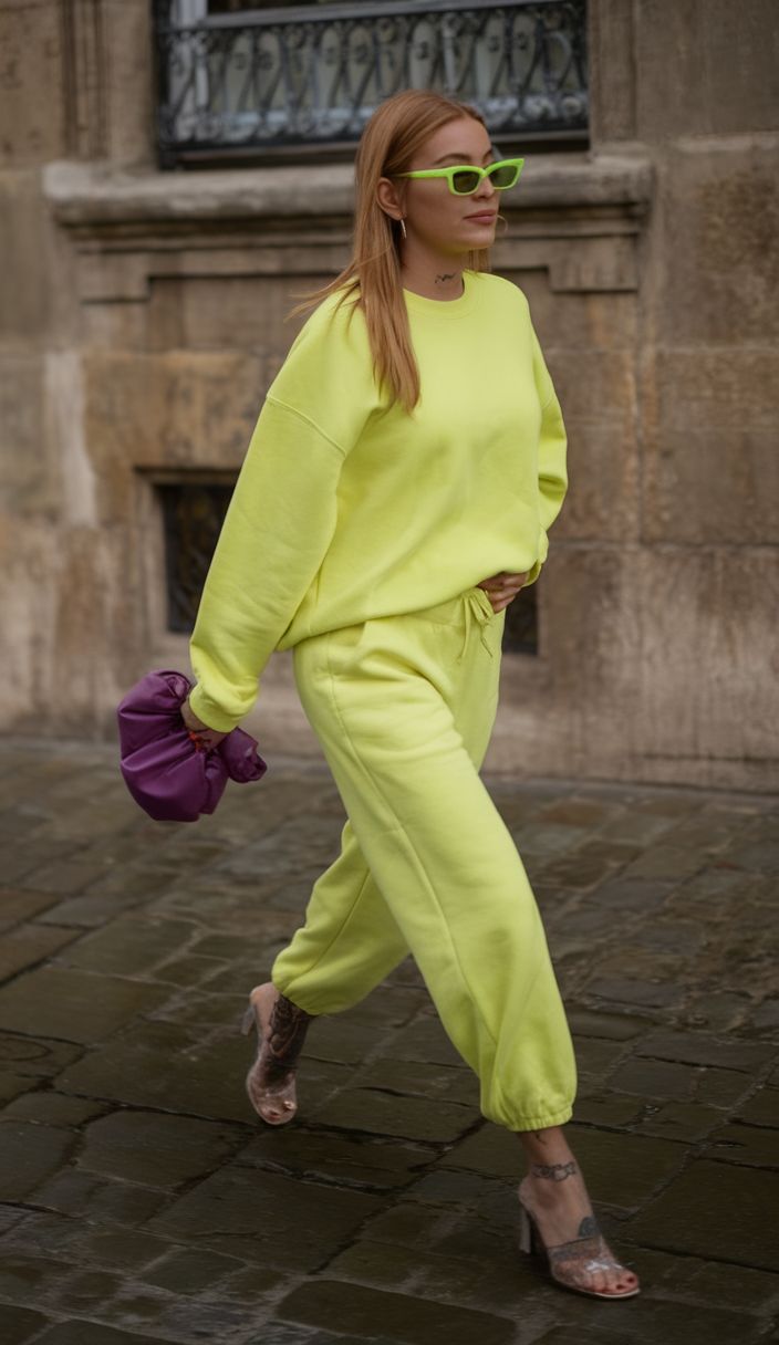 This high-energy neon yellow tracksuit is fearless, modern, and undeniably bold—the kind of look that thrives on movement. It suits sporty, rectangular, or tall silhouettes because the uniform color emphasizes length and momentum. Ideal for street style, fashion weeks, or athleisure-leaning days. The neon tone is less appropriate for formal or professional environments.